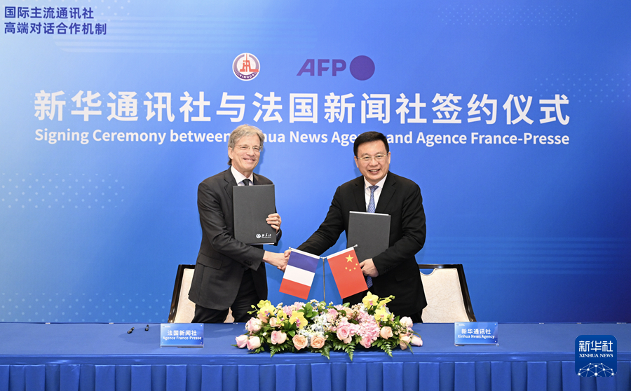 新華社社長傅華同來訪的法新社社長兼首席執(zhí)行官法布里斯·弗里共同在諒解備忘錄上簽字。這是去年12月國際主流通訊社高端對話合作機(jī)制在世界媒體峰會框架下建立以來達(dá)成的首個具體合作成果。