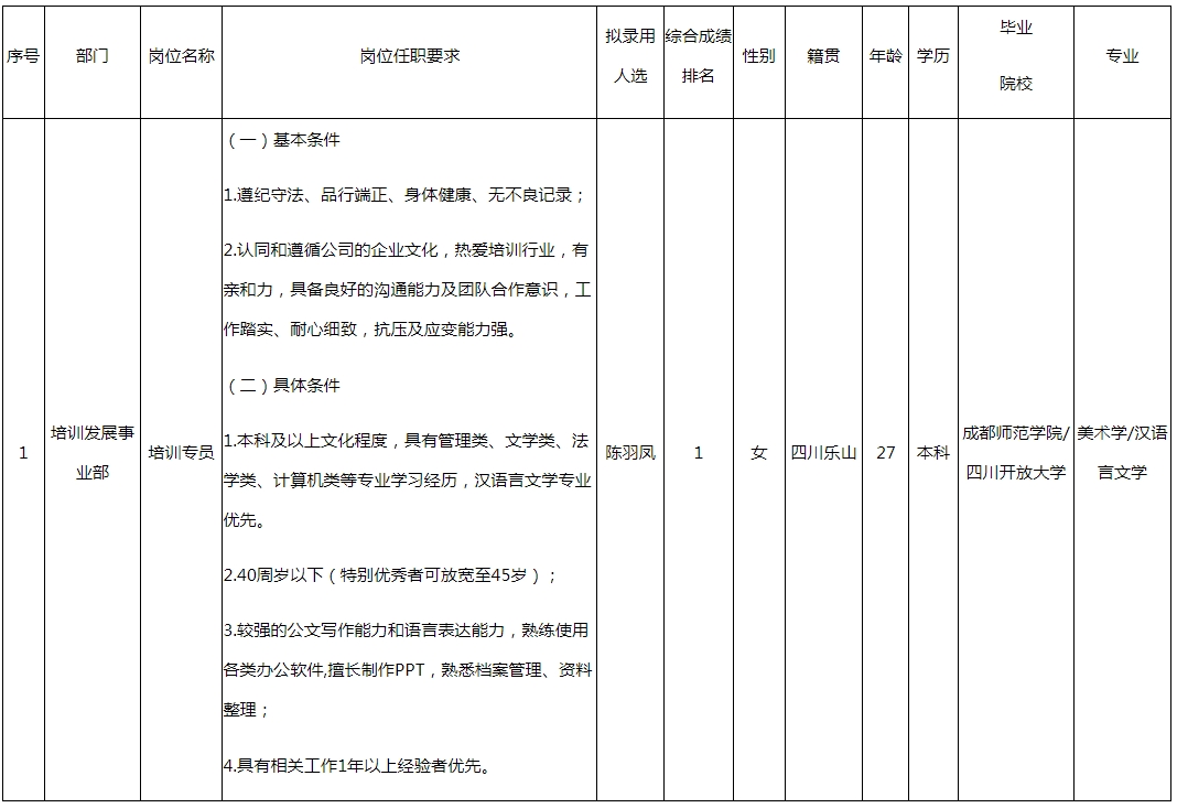 根據(jù)四川九洲教育投資管理有限公司發(fā)布的招聘公告及招聘相關(guān)規(guī)定,經(jīng)筆試、面試、考察、體檢等程序,擬錄用陳羽鳳同志到四川九洲教育投資管理有限公司工作,現(xiàn)予以公示,具體情況如下: