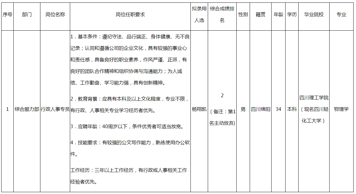 根據(jù)四川長虹電子科技有限公司發(fā)布的招聘公告及招聘相關(guān)規(guī)定,經(jīng)筆試、面試、考察、體檢等程序,擬錄用楊翔凱同志到四川長虹電子科技有限公司工作,現(xiàn)予以公示,具體情況如下: