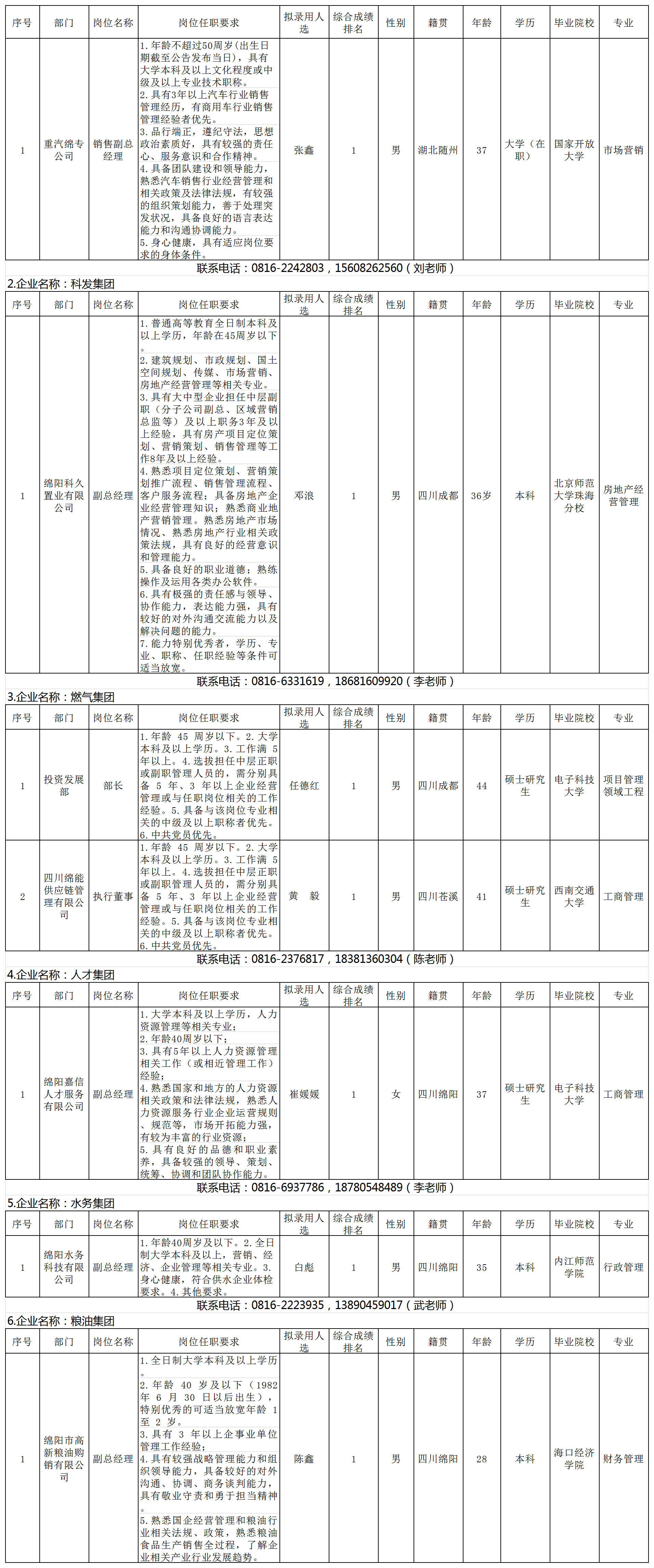 根據(jù)綿陽(yáng)市國(guó)資委發(fā)布的面向全國(guó)選聘20名國(guó)企經(jīng)營(yíng)管理人員的公告及相關(guān)規(guī)定,對(duì)前期成績(jī)公示中的11個(gè)崗位應(yīng)聘人員經(jīng)組織考察、體檢等程序,擬錄用張?chǎng)蔚?名同志到各選聘企業(yè)工作,4個(gè)崗位終止選聘,其中九洲集團(tuán)北京九洲科瑞科技有限公司運(yùn)營(yíng)總監(jiān)崗、科發(fā)集團(tuán)工程部副部長(zhǎng)(工程項(xiàng)目)崗、交發(fā)集團(tuán)交發(fā)實(shí)業(yè)資產(chǎn)物業(yè)管理部副部長(zhǎng)崗應(yīng)聘人員綜合成績(jī)均低于企業(yè)要求的最低分,終止選聘;交發(fā)集團(tuán)交發(fā)順達(dá)運(yùn)營(yíng)管理部負(fù)責(zé)人崗因排名第一的應(yīng)聘人員主動(dòng)放棄且無(wú)符合條件的遞補(bǔ)人員,終止選聘。現(xiàn)予以公示,具體情況如下: