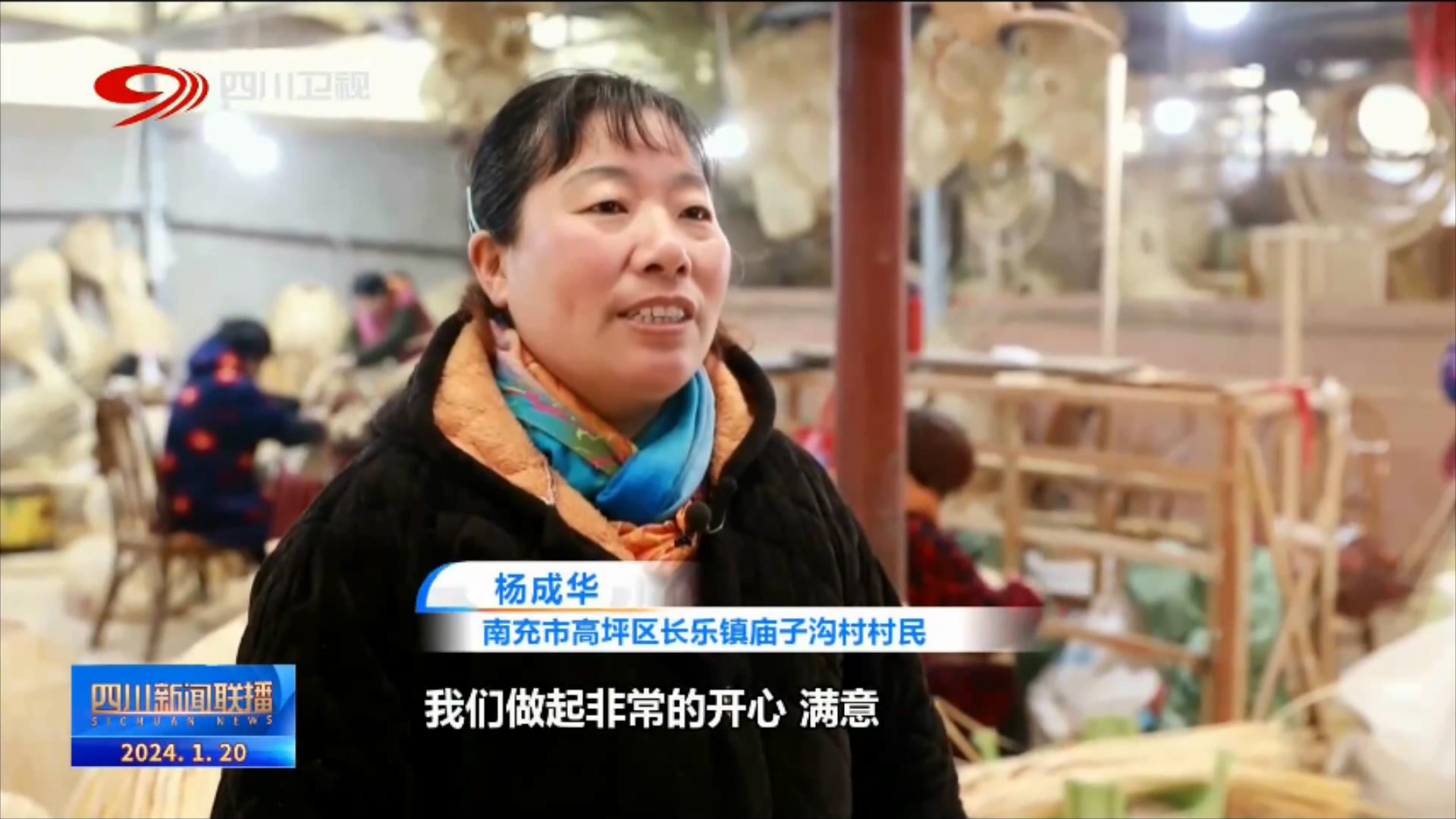 南充市高坪區(qū)長(zhǎng)樂(lè)鎮(zhèn)廟子溝村村民 楊成華:工資一個(gè)月有三千多至四千,我們做起非常的開(kāi)心、滿意。在廠頭可以編,在家里也可以編,老人小孩都照看了。