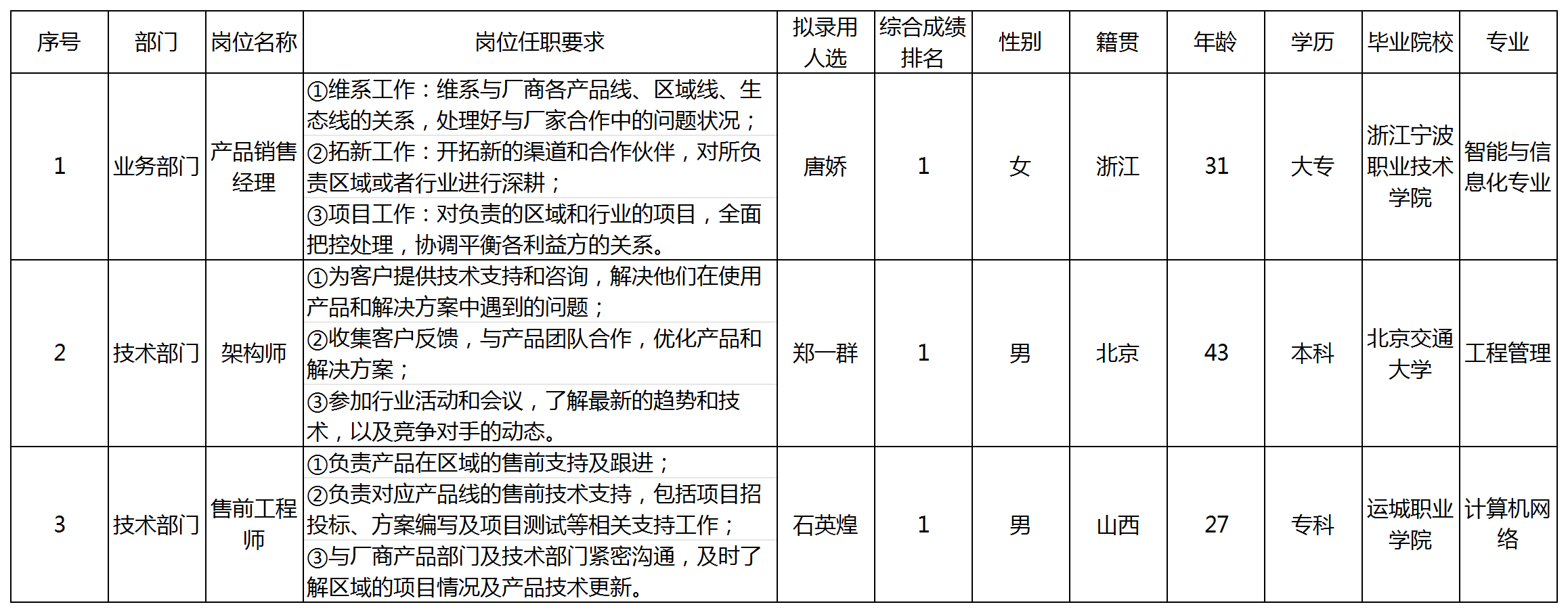 根據四川長虹佳華信息產品有限責任公司發(fā)布的招聘公告及招聘相關規(guī)定,經面試、考察、體檢等程序,擬錄用唐嬌、鄭一群、石英煌同志到四川長虹佳華信息產品有限責任公司工作,現予以公示,具體情況如下: