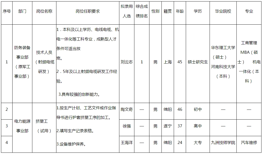 根據(jù)四川九洲線纜有限責任公司發(fā)布的招聘公告及招聘相關(guān)規(guī)定,經(jīng)面試、考察、體檢等程序,擬錄用劉云志等同志到四川九洲線纜有限責任公司工作,現(xiàn)予以公示,具體情況如下: