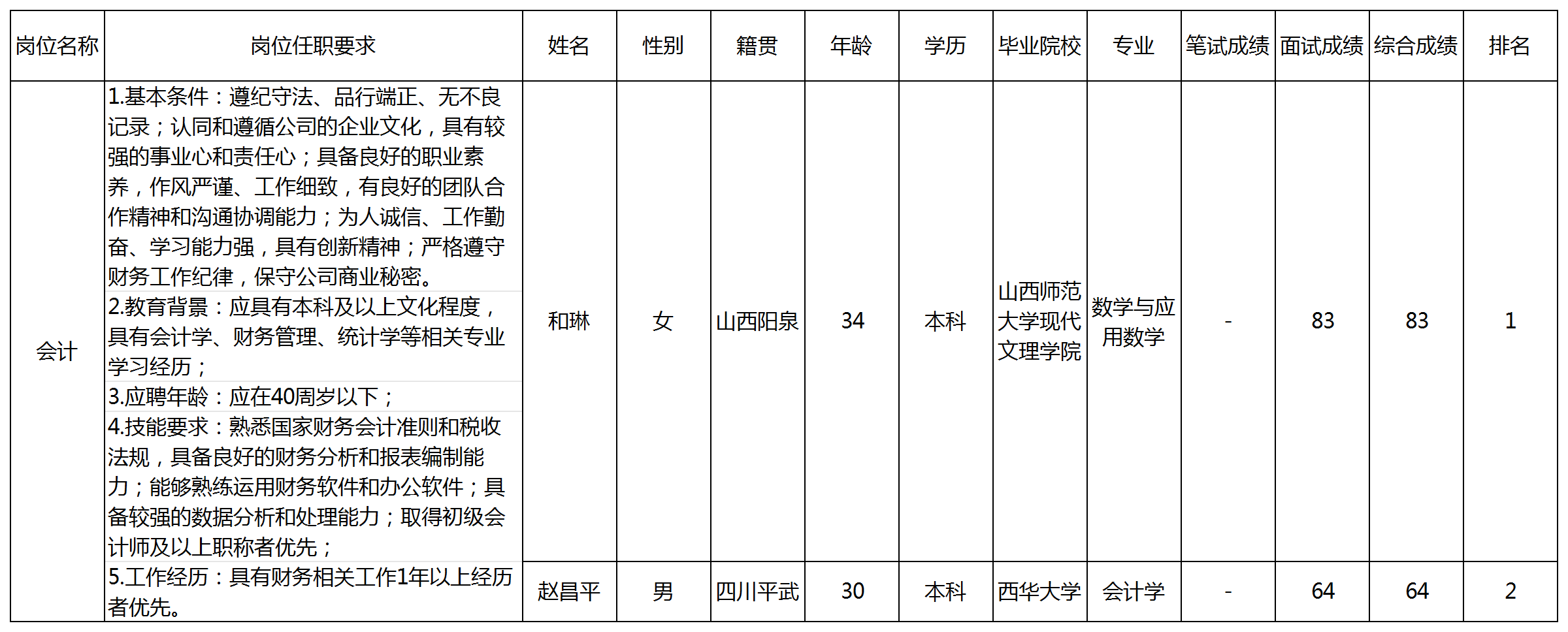 根據(jù)四川九洲教育投資管理有限公司發(fā)布的招聘公告及招聘相關(guān)規(guī)定,經(jīng)筆試、面試等程序,現(xiàn)將筆試(面試)成績(jī)予以公示。
