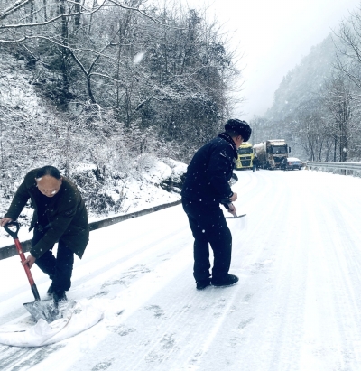 1月21日凌晨,平武境內(nèi)出現(xiàn)一輪明顯降雪過程,為保障道路交通安全。21日6時許,平武縣公安局白馬派出所聯(lián)合縣交警大隊(duì)、鄉(xiāng)政府、公路管理所組織村民對G247國道平武至九寨溝方向路段積雪進(jìn)行了處理。過程中,民警對臨水、臨崖、橋梁、急彎、陡坡等易積雪、結(jié)冰路段,通過拋灑工業(yè)鹽、遠(yuǎn)端設(shè)置臨時執(zhí)勤點(diǎn)勸返等措施強(qiáng)化路面管控。