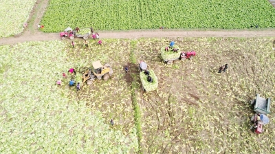 春種水稻秋種青菜,稻菜輪作模式在提高土地利用率的同時(shí),也讓村民們一年四季有活兒干有收入。“目前正是收割季節(jié),每天有三四十個(gè)工人,有七八個(gè)車,收割工人每人每天的工資大概在100元左右。”李文說。
