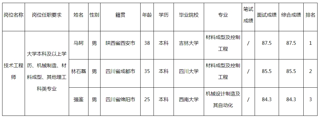 根據(jù)四川波鴻實業(yè)有限公司發(fā)布的招聘公告及招聘相關規(guī)定,經(jīng)面試后,現(xiàn)將四川綿陽好圣汽車零部件制造有限公司技術工程師面試成績予以公示。