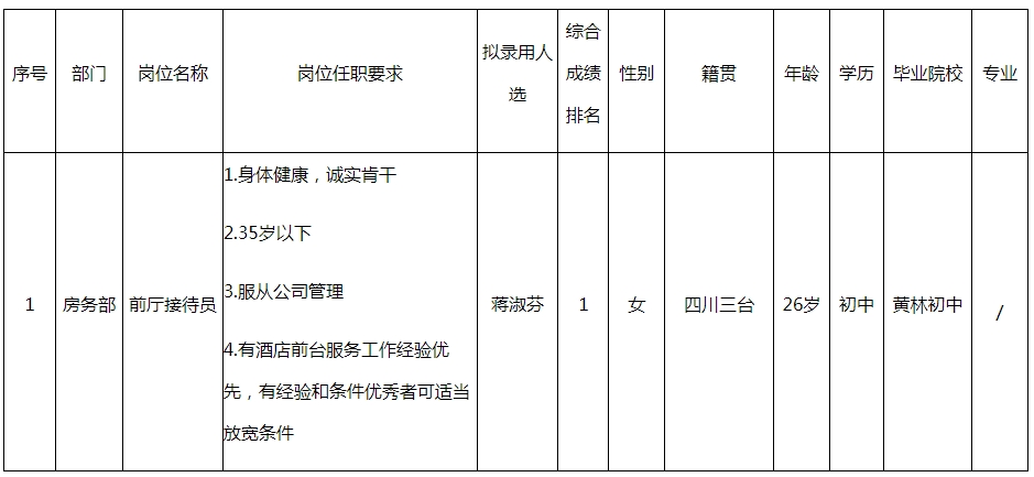 根據(jù)四川梓樂(lè)文化旅游開(kāi)發(fā)有限公司發(fā)布的招聘公告及招聘相關(guān)規(guī)定,經(jīng)面試、考察、體檢等程序,擬錄用蔣淑芬同志到梓州明宇麗雅酒店工作,現(xiàn)予以公示,具體情況如下: