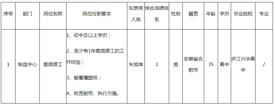根據(jù)安徽菱安醫(yī)療器械有限公司發(fā)布的招聘公告及招聘相關(guān)規(guī)定,經(jīng)面試、考察、體檢等程序,擬錄用朱旭坤同志到制造中心工作,現(xiàn)予以公示,具體情況如下: