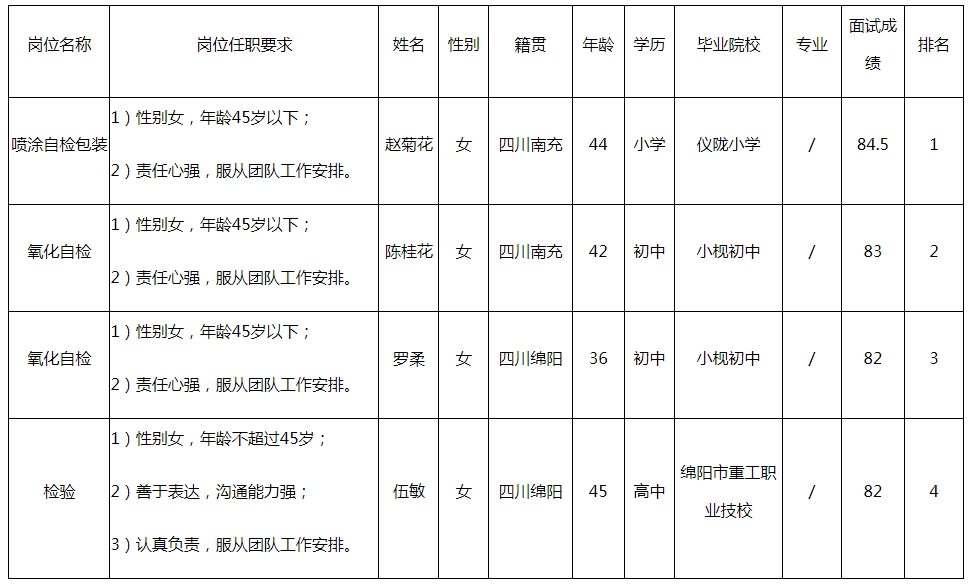 根據(jù)四川長虹技佳精工有限公司發(fā)布的招聘公告及招聘相關(guān)規(guī)定,經(jīng)考察、面試等程序,現(xiàn)將面試成績予以公示。