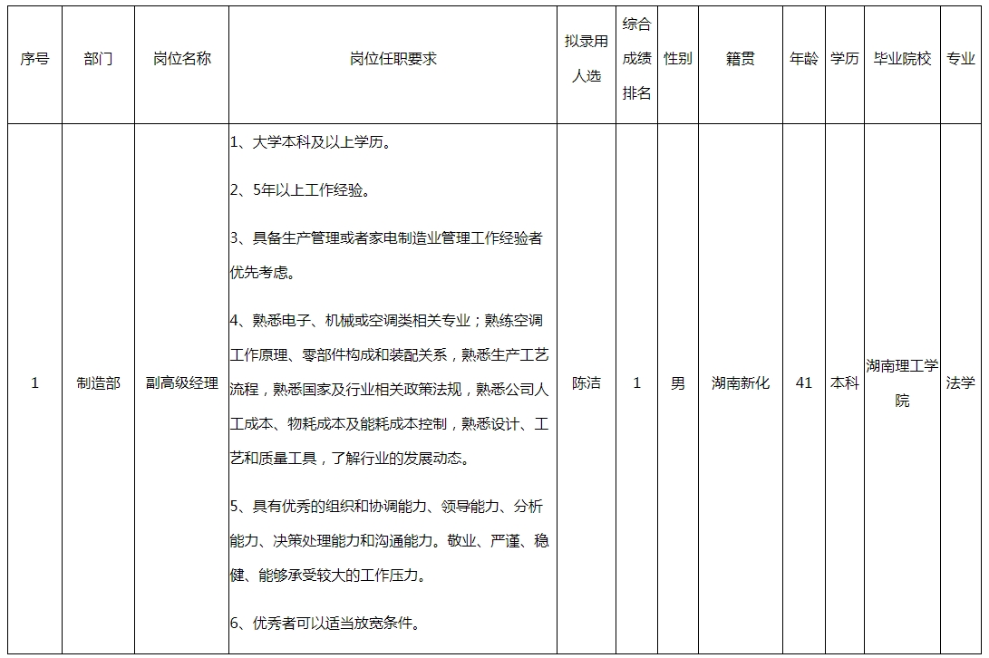 根據(jù)中山長虹電器有限公司發(fā)布的招聘公告及招聘相關(guān)規(guī)定,經(jīng)面試、考察、體檢等程序,擬錄用陳潔同志到副高級經(jīng)理工作,現(xiàn)予以公示,具體情況如下: