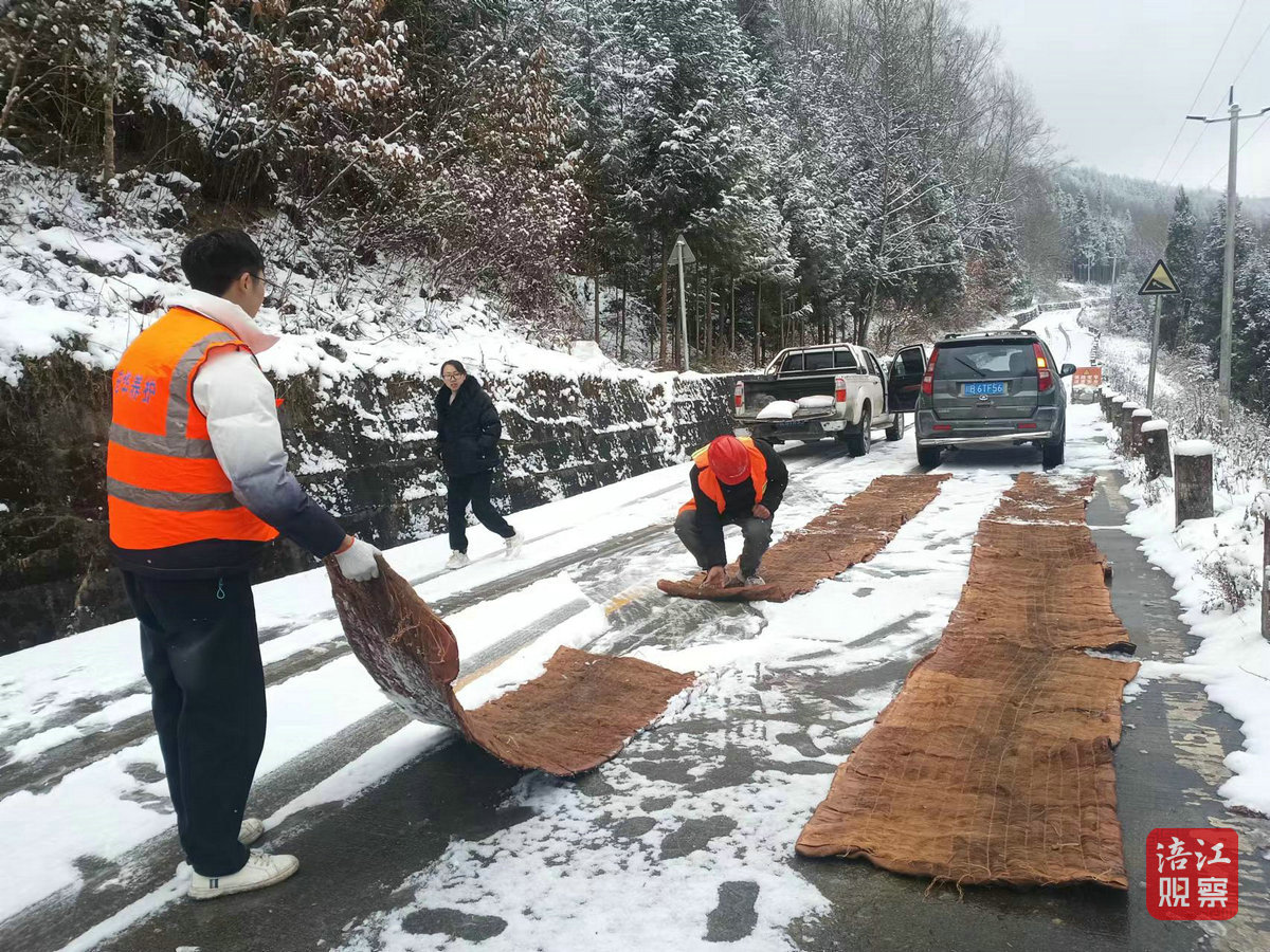 1月24日上午,在北川都貫-開(kāi)坪公路上,公路養(yǎng)護(hù)人員為道路危險(xiǎn)易滑路段撒融雪劑、鋪設(shè)防滑棕墊、設(shè)置交通標(biāo)志牌,與交警一同勸返車輛。