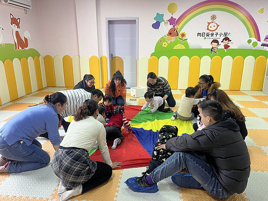 2024年1月13日,重慶市江北區(qū)魚嘴鎮(zhèn)“向日葵親子小屋”“趣玩彩虹傘”親子課堂開課。中國(guó)計(jì)生協(xié)供圖