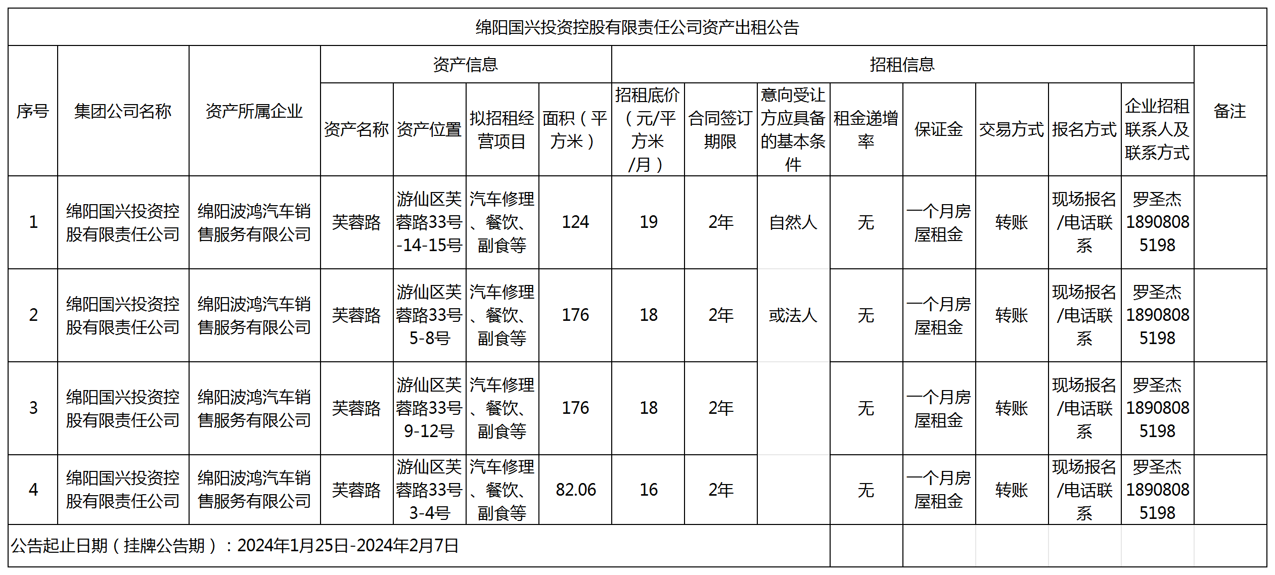 綿陽國興投資控股有限責(zé)任公司資產(chǎn)出租公告