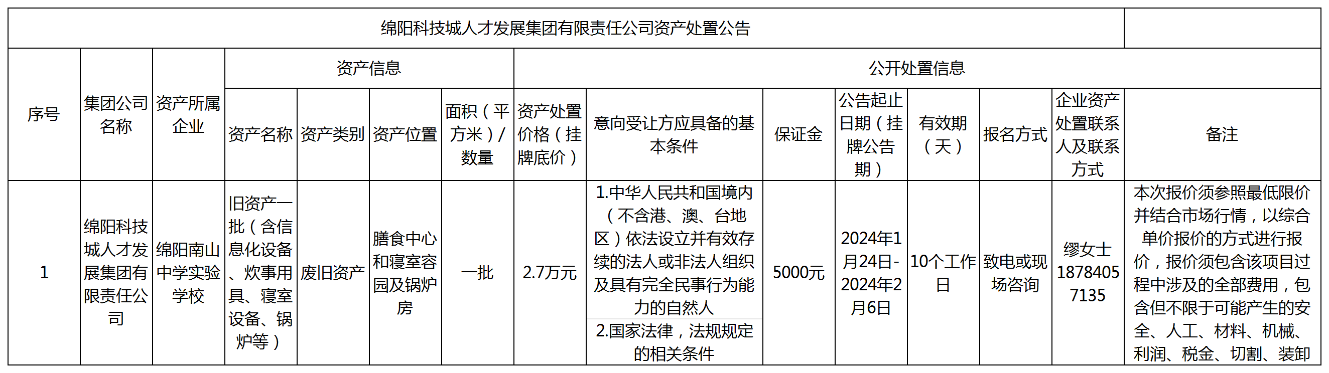 綿陽科技城人才發(fā)展集團有限責任公司資產(chǎn)處置公告