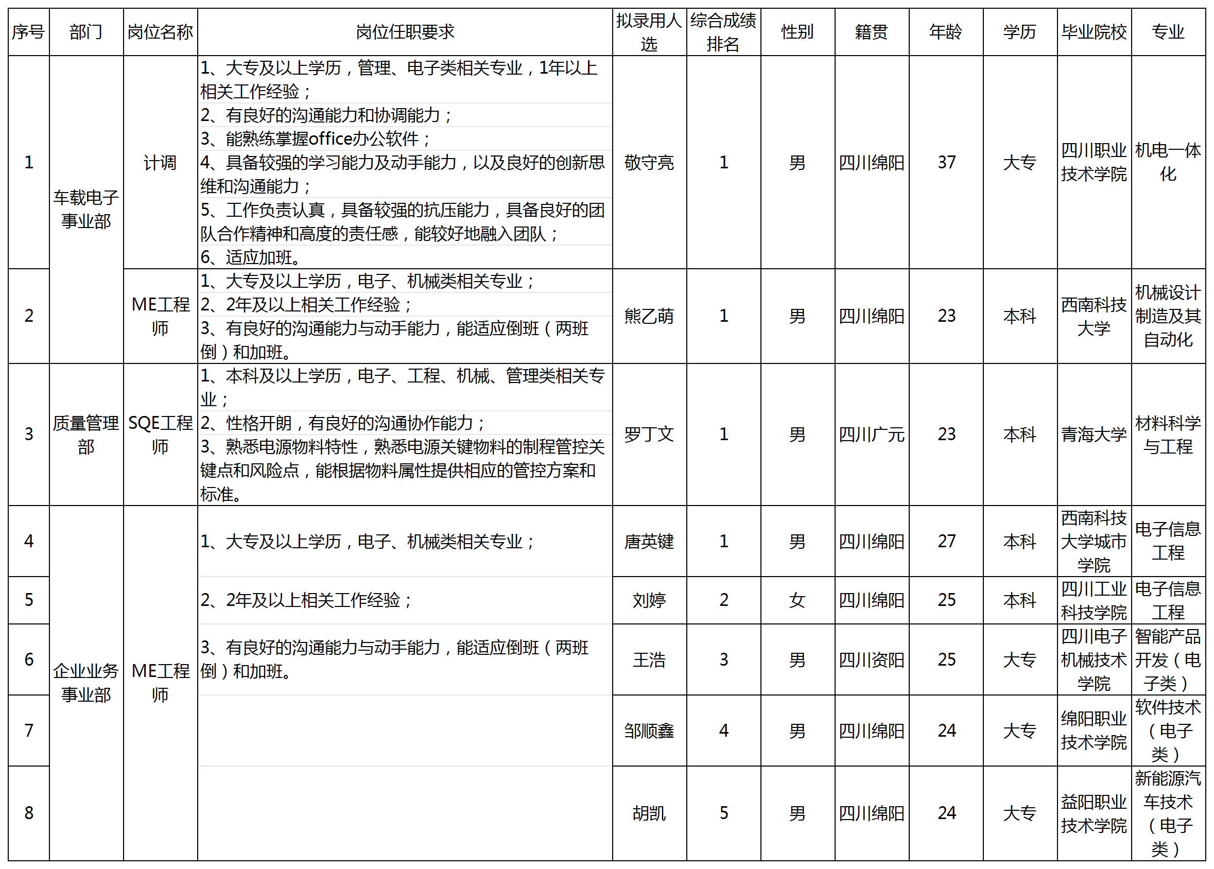 根據(jù)四川九州電子科技股份有限公司發(fā)布的招聘公告及招聘相關(guān)規(guī)定,經(jīng)筆試、面試、考察、體檢等程序,擬錄用敬守亮等8名同志到四川九州電子科技股份有限公司工作,現(xiàn)予以公示,具體情況如下: