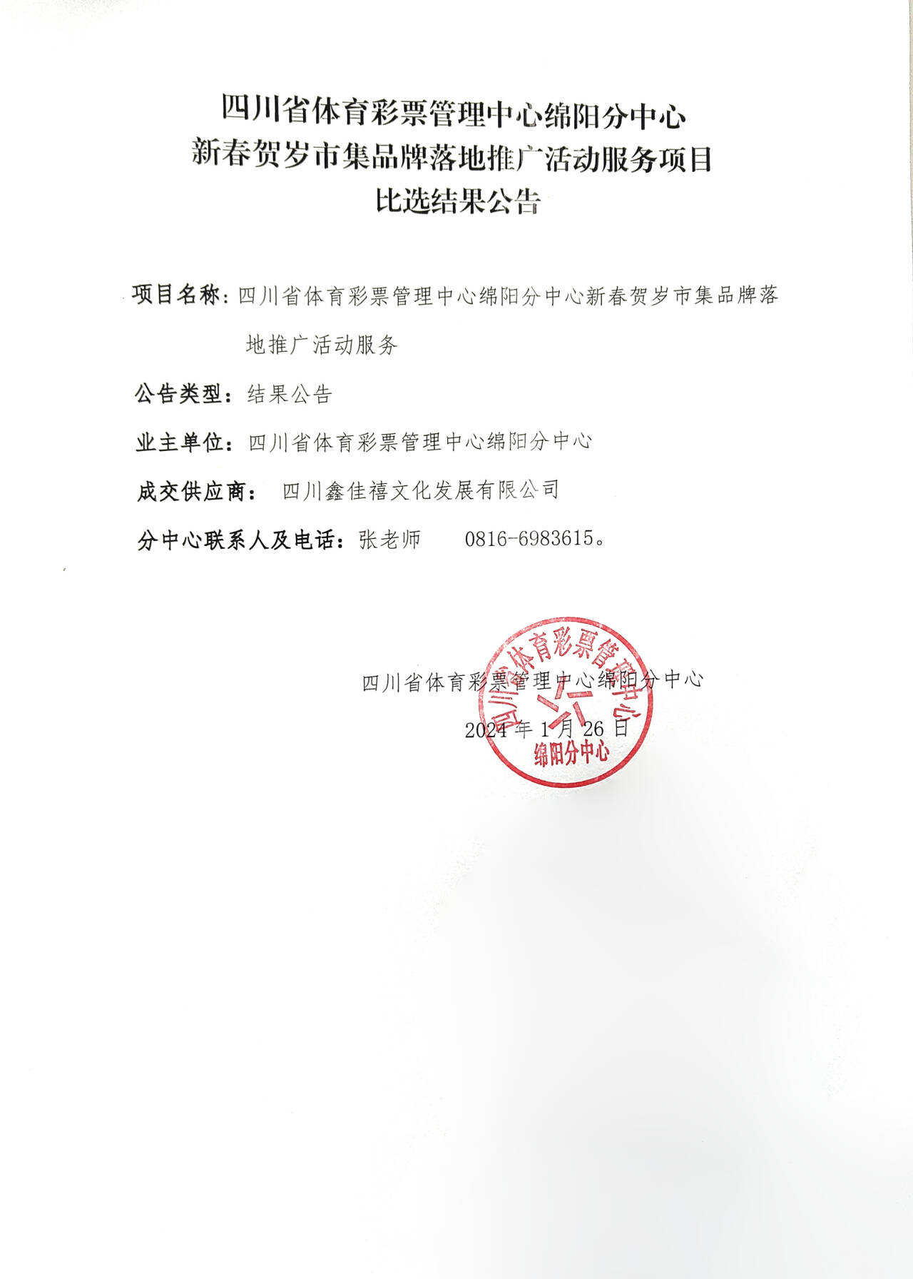 四川省體育彩票管理中心綿陽分中心新春賀歲市集品牌落地推廣活動(dòng)服務(wù)項(xiàng)目比選結(jié)果公告