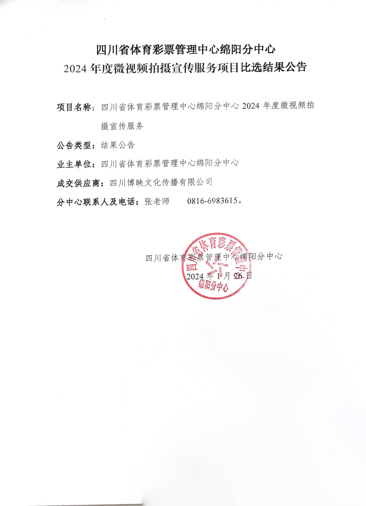 四川省體育彩票管理中心綿陽(yáng)分中心2024年度微視頻拍攝宣傳服務(wù)項(xiàng)目比選結(jié)果公告
