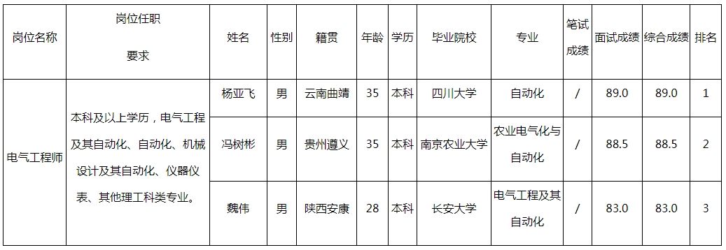 根據(jù)四川波鴻實(shí)業(yè)有限公司發(fā)布的招聘公告及招聘相關(guān)規(guī)定,經(jīng)面試后,現(xiàn)將四川綿陽好圣汽車零部件制造有限公司電氣工程師面試成績(jī)予以公示。