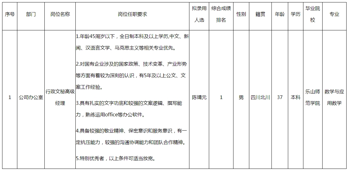 根據(jù)長(zhǎng)虹控股集團(tuán)發(fā)布的招聘公告及招聘相關(guān)規(guī)定,經(jīng)筆試、面試、考察、體檢等程序,擬錄用陳靖元同志到行政文秘高級(jí)經(jīng)理崗位工作,現(xiàn)予以公示,具體情況如下:
