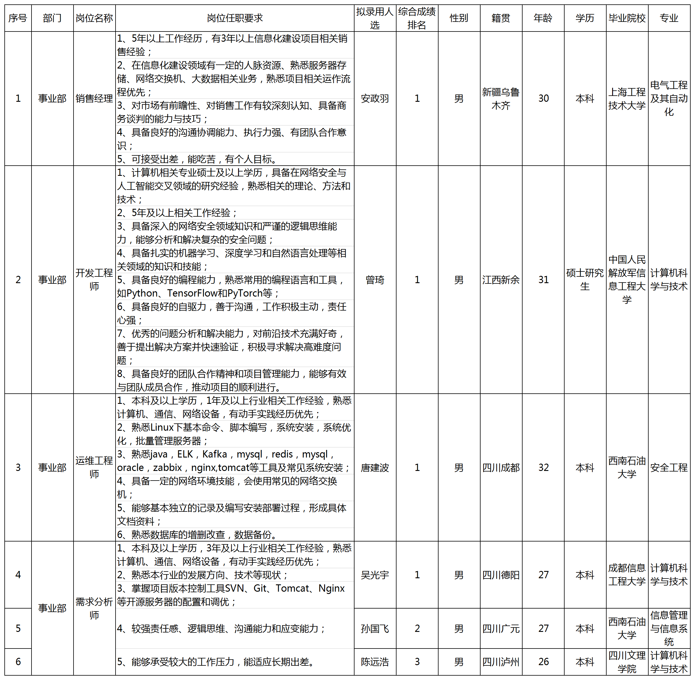 根據(jù)成都九洲電子信息系統(tǒng)股份有限公司發(fā)布的招聘公告及招聘相關規(guī)定,經(jīng)筆試、面試、考察等程序,擬錄用安政羽等同志到成都九洲電子信息系統(tǒng)股份有限公司工作,現(xiàn)予以公示,具體情況如下: