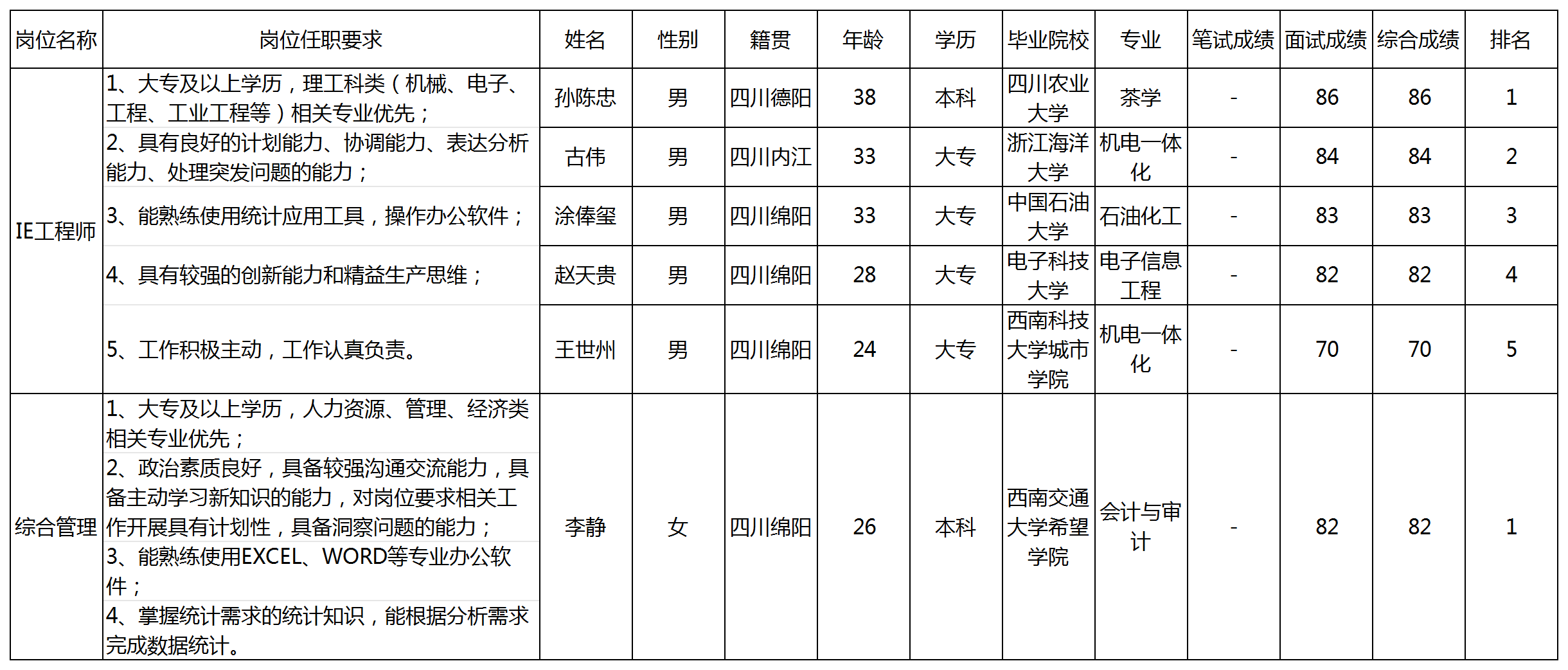 根據(jù)四川九州電子科技股份有限公司發(fā)布的招聘公告及招聘相關(guān)規(guī)定,經(jīng)筆試、面試等程序,現(xiàn)將筆試(面試)成績予以公示。