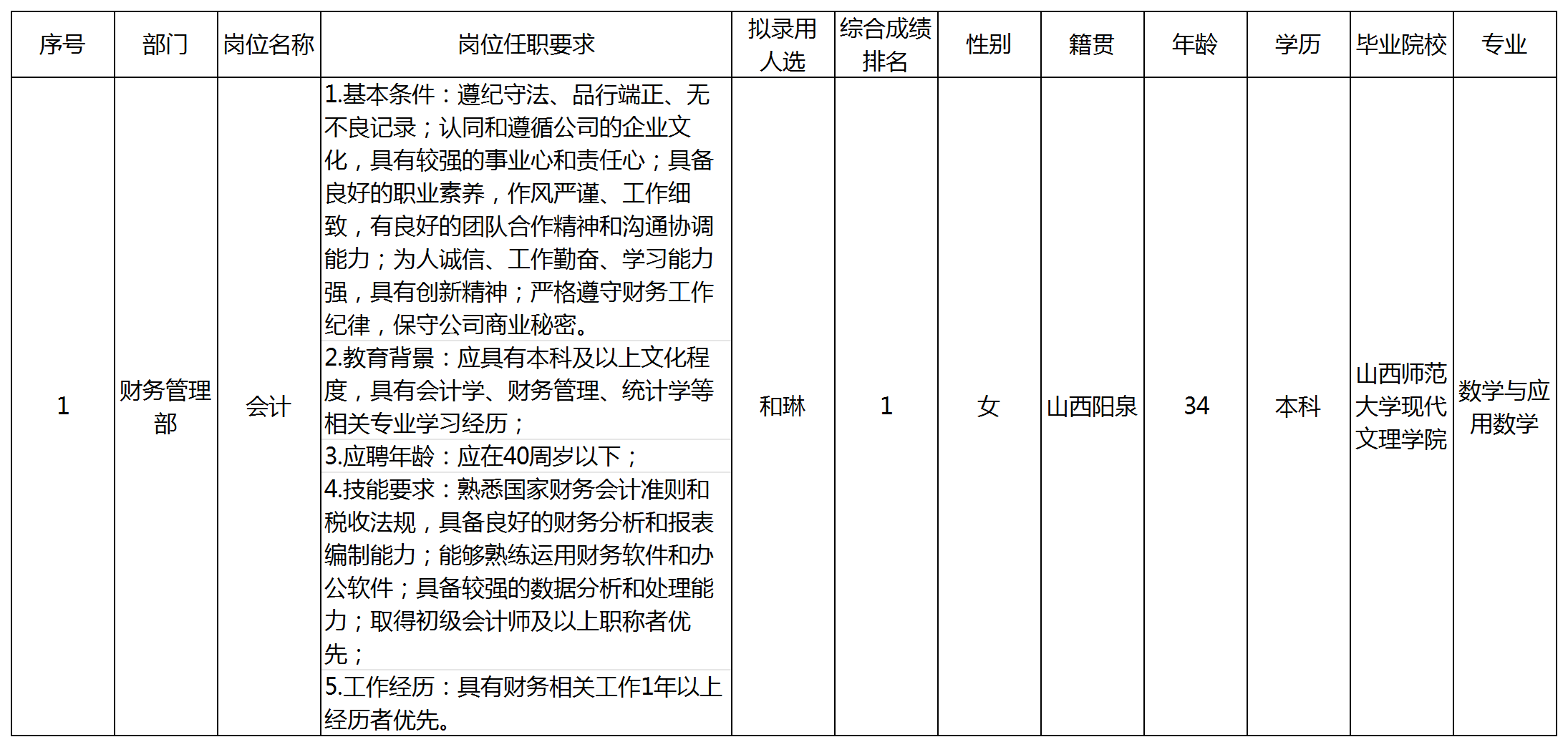 根據(jù)四川九洲教育投資管理有限公司發(fā)布的招聘公告及招聘相關(guān)規(guī)定,經(jīng)筆試、面試、考察、體檢等程序,擬錄用和琳同志到四川九洲教育投資管理有限公司工作,現(xiàn)予以公示,具體情況如下: