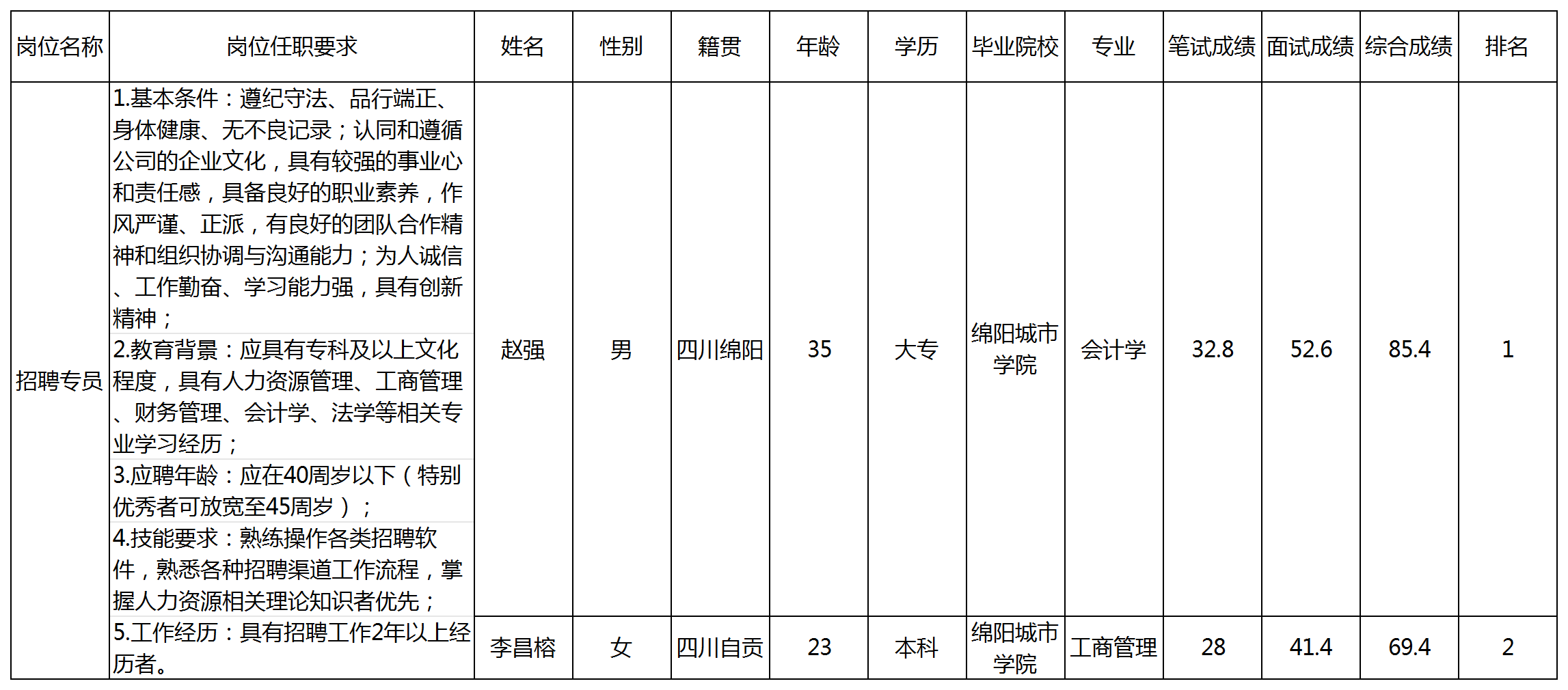 根據(jù)綿陽(yáng)科技城中科人才服務(wù)有限公司發(fā)布的招聘公告及招聘相關(guān)規(guī)定,經(jīng)筆試、面試等程序,現(xiàn)將筆試(面試)成績(jī)予以公示。