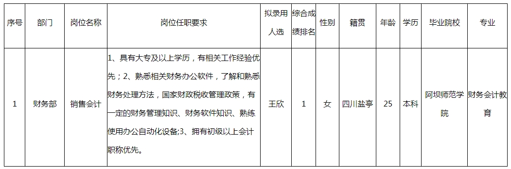 根據(jù)格潤(rùn)中天公司發(fā)布的招聘公告及招聘相關(guān)規(guī)定,經(jīng)面試、體檢等程序,擬錄用王欣同志到格潤(rùn)中天財(cái)務(wù)部工作,現(xiàn)予以公示,具體情況如下: