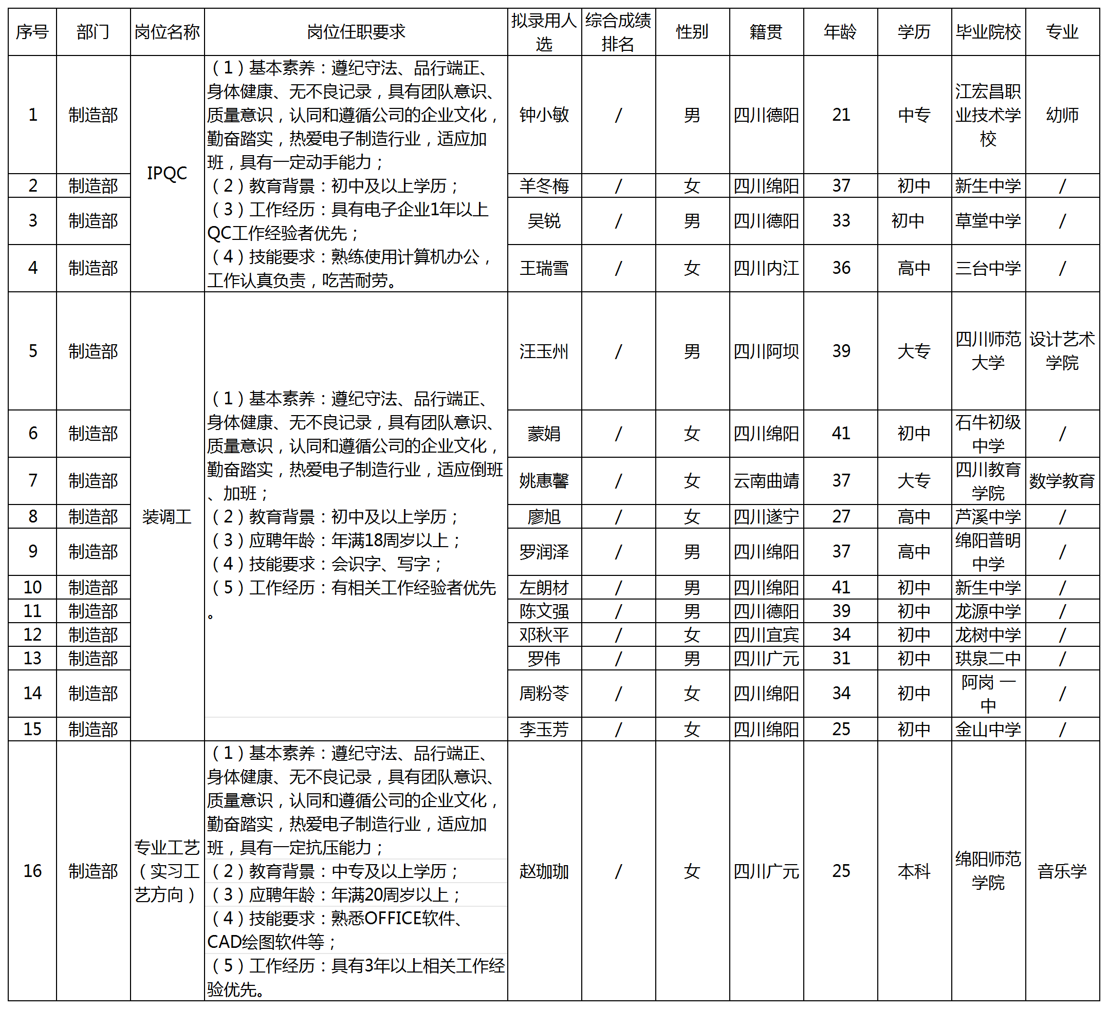 根據(jù)長虹電器股份有限公司(多媒體公司)發(fā)布的招聘公告及招聘相關(guān)規(guī)定,經(jīng)面試、考察、體檢等程序,2024年1月擬錄用以下16人到制造部工作,現(xiàn)予以公示,具體情況如下: