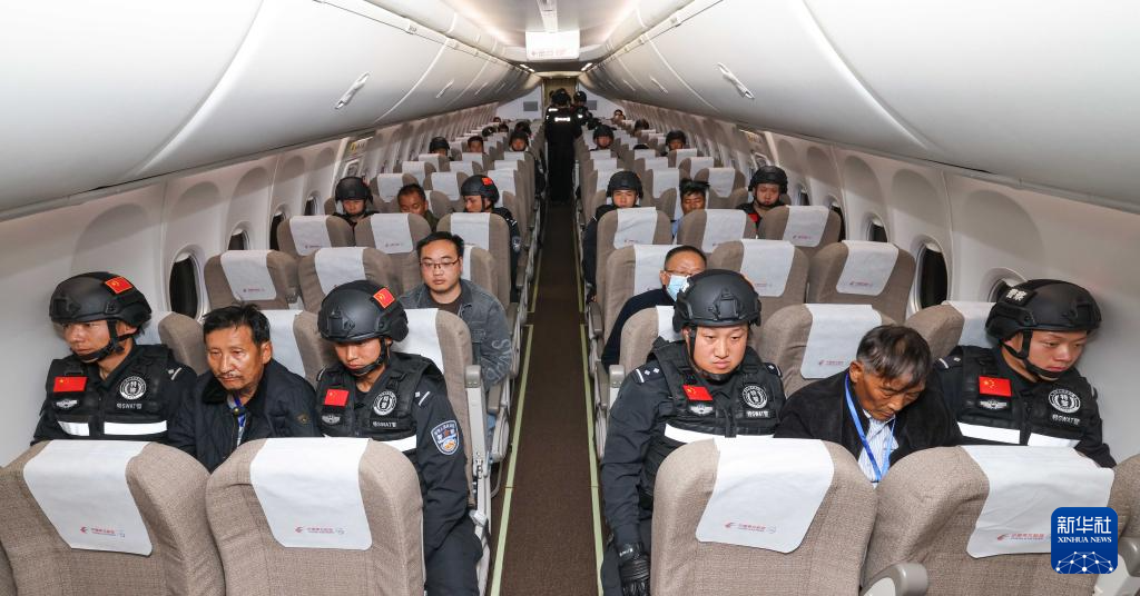 1月30日,白所成、白應(yīng)蒼、魏懷仁、劉正祥、劉正茂、徐老發(fā)等10名緬北重大犯罪嫌疑人在被押解回國(guó)的飛機(jī)上。新華社記者 殷剛 攝