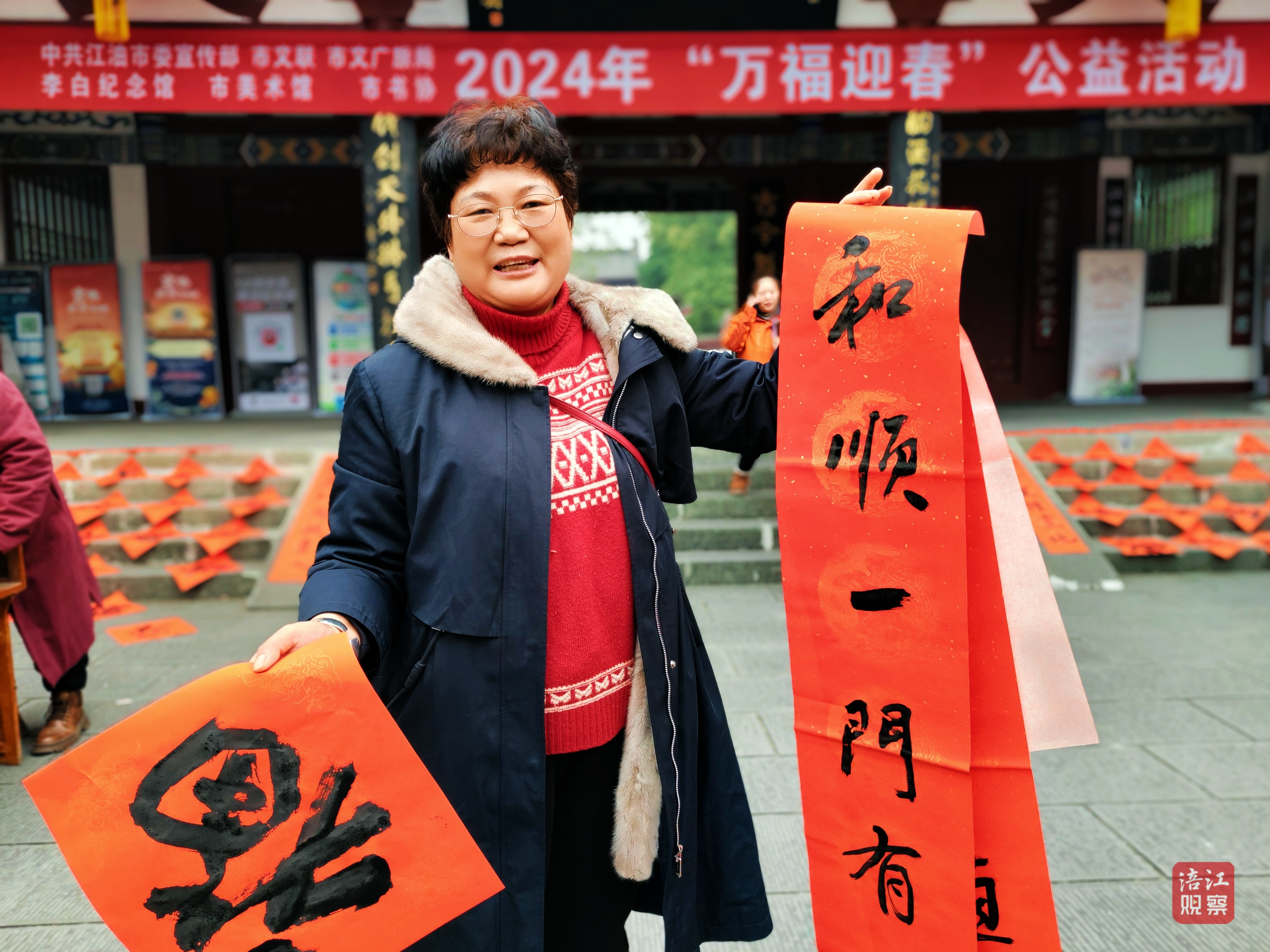 在江油市李白紀(jì)念館前廣場,江油市委宣傳部組織“萬福迎春”贈寫春聯(lián)公益活動,向市民送出新春的美好祝福。