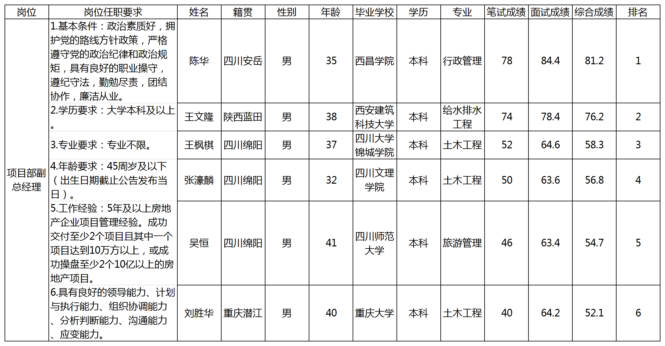 根據(jù)綿陽(yáng)市綿投置地有限公司發(fā)布的招聘公告及招聘相關(guān)規(guī)定,經(jīng)面試、筆試相關(guān)程序,現(xiàn)將綜合考評(píng)成績(jī)予以公示。