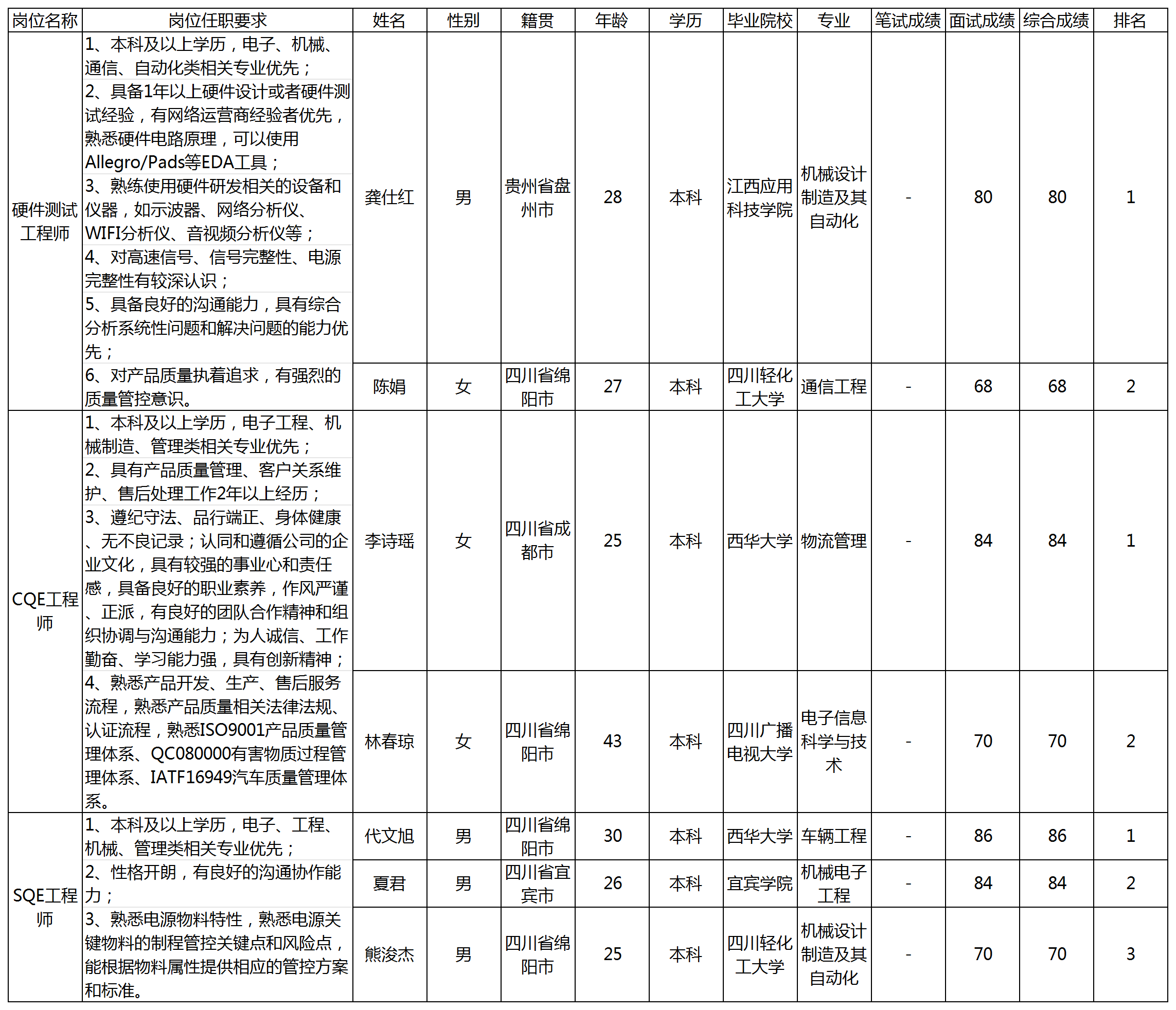 根據(jù)四川九州電子科技股份有限公司發(fā)布的招聘公告及招聘相關(guān)規(guī)定,經(jīng)筆試、面試等程序,現(xiàn)將筆試(面試)成績予以公示。