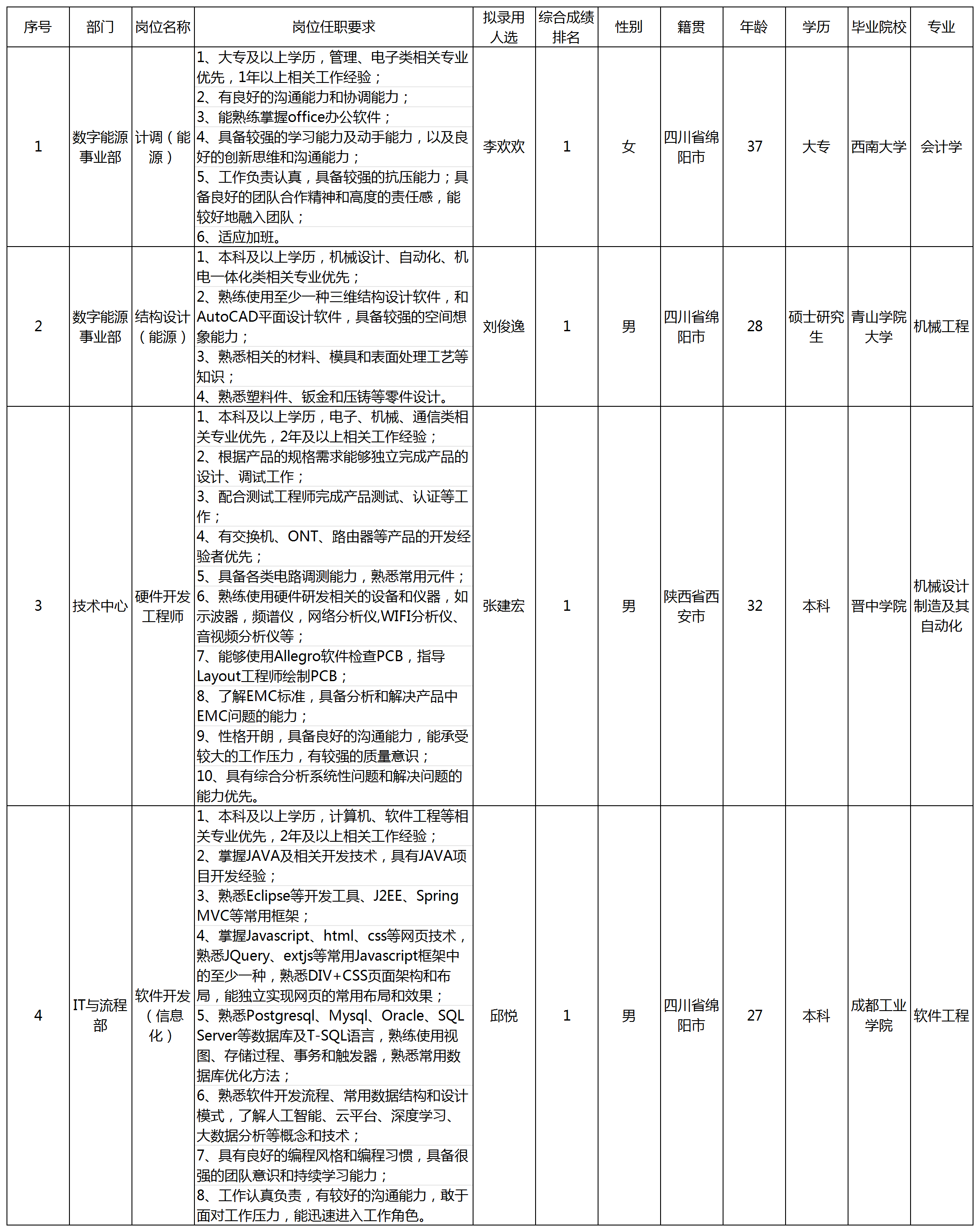 根據(jù)四川九州電子科技股份有限公司發(fā)布的招聘公告及招聘相關(guān)規(guī)定,經(jīng)筆試、面試、考察、體檢等程序,擬錄用李歡歡,劉俊逸,張建宏,邱悅同志到四川九州電子科技股份有限公司工作,現(xiàn)予以公示,具體情況如下: