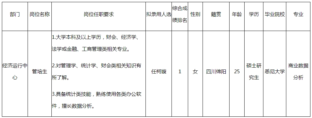 根據(jù)四川波鴻實(shí)業(yè)有限公司發(fā)布的招聘公告及招聘相關(guān)規(guī)定,經(jīng)面試,擬錄用以下人員為四川波鴻實(shí)業(yè)有限公司經(jīng)濟(jì)運(yùn)行中心管培生,現(xiàn)予以公示,具體情況如下:
