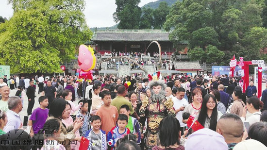 平武報恩寺前,游客爭相與悟空扮演者合影。(記者 鄭金容 攝)