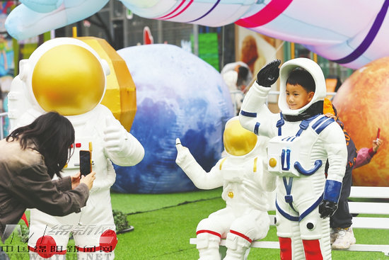 小朋友在涪城區(qū)王府井的科技城航天展留影(記者 陳冬冬 攝)