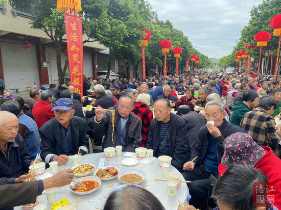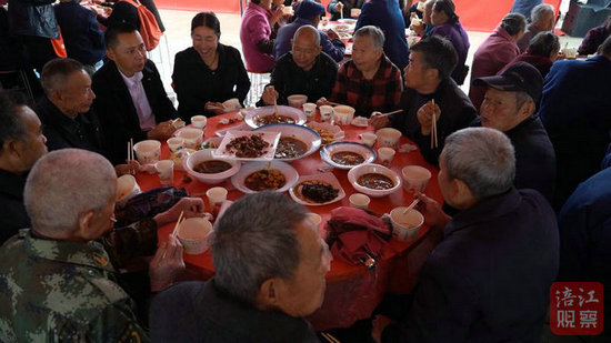 在江油市厚壩鎮(zhèn)文勝村,80桌壩壩宴讓全村老人共享口福。800多位老人收到了愛心商家贊助的節(jié)日禮品,并觀看了村里文藝愛好者自編自演的有趣節(jié)目。