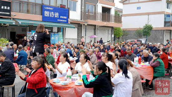 活動(dòng)現(xiàn)場(chǎng),村民們載歌載舞頌歌新時(shí)代,歡度重陽節(jié)。節(jié)目表演結(jié)束后,老人們圍坐在一起,吃壩壩宴、嘮家常,流淌著濃濃的幸福味道。