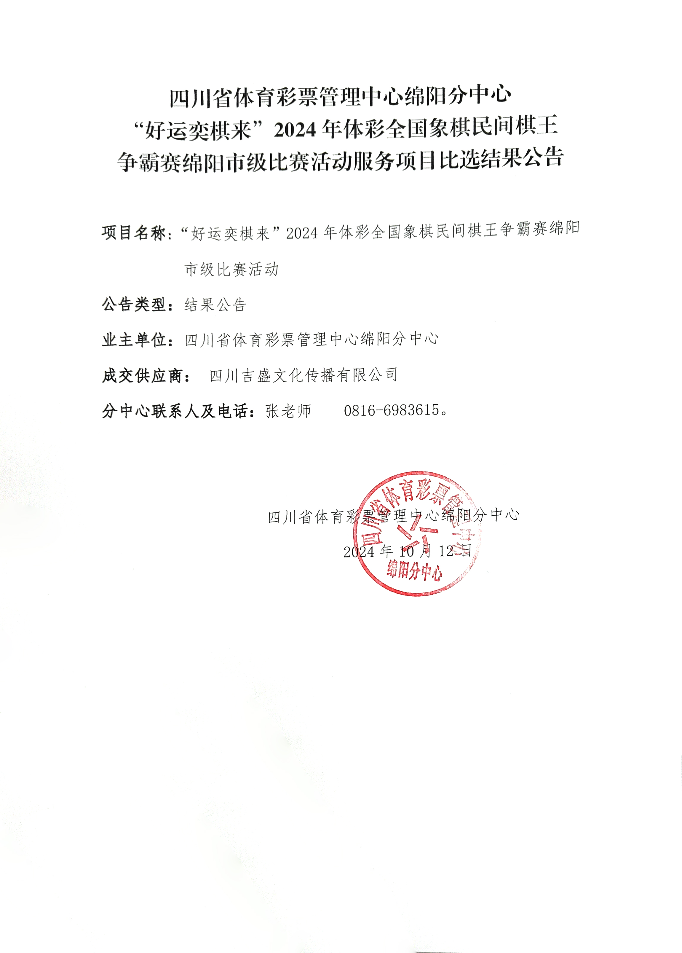 四川省體育彩票管理中心綿陽分中心“好運奕棋來”2024年體彩全國象棋民間棋王爭霸賽綿陽市級比賽活動服務項目比選結(jié)果公告