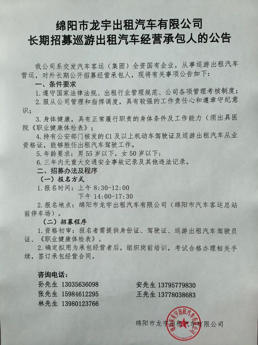 綿陽市龍宇出租汽車有限公司長(zhǎng)期招募巡游出租汽車經(jīng)營(yíng)承包人,詳情請(qǐng)致電:13035636098、18281951555