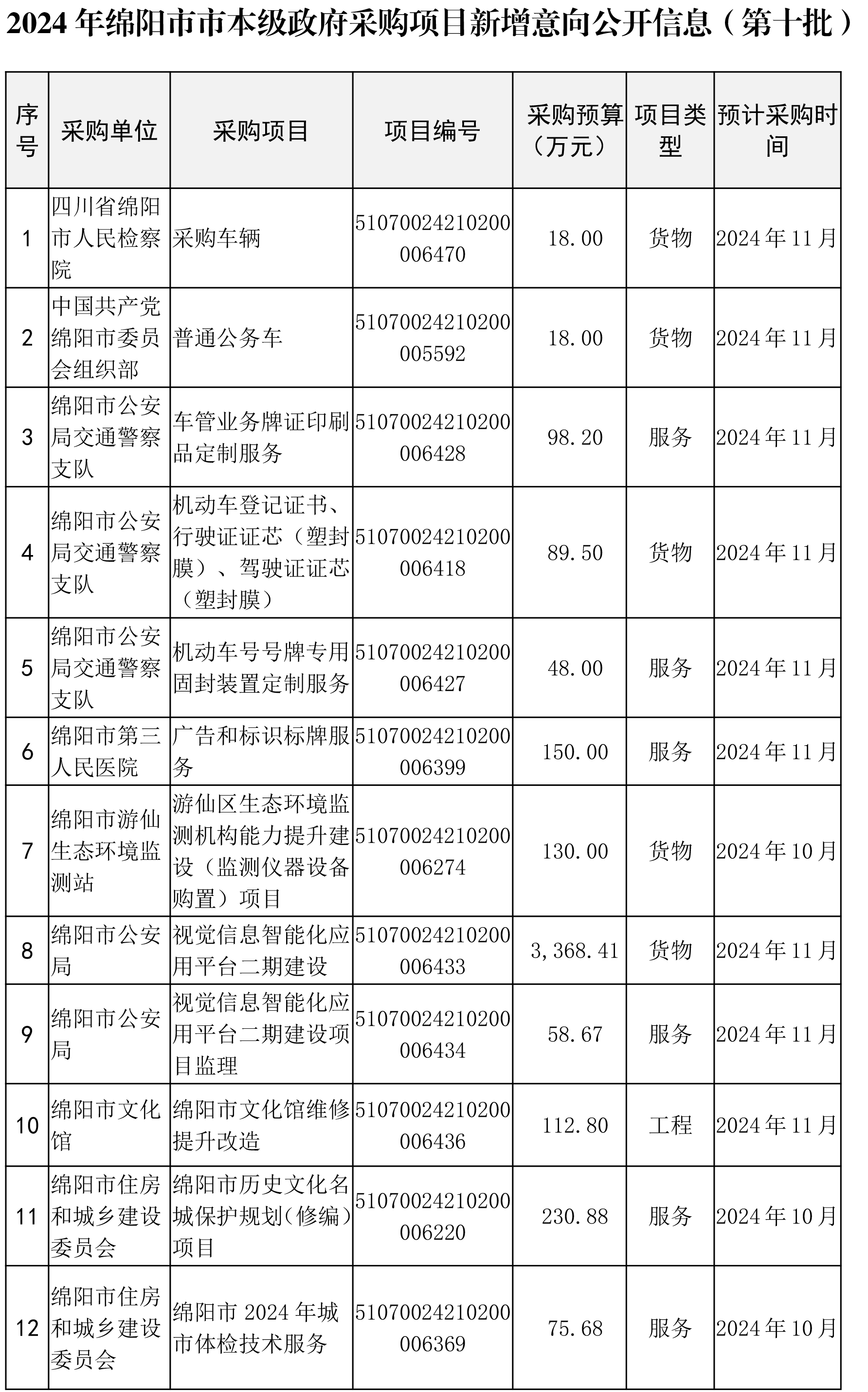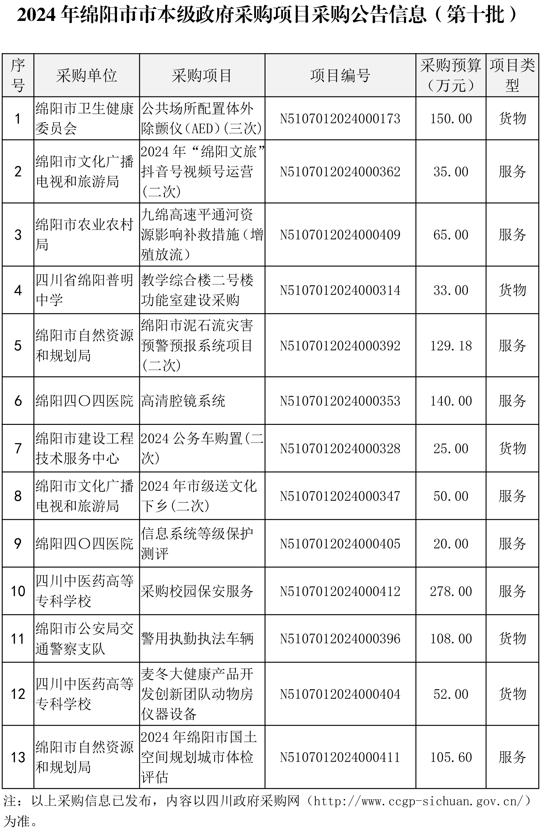 此批綿陽市市本級政府采購項目集中發(fā)布采購公告信息共計13個(于10月14日前已掛網(wǎng)),采購預(yù)算金額1190.78萬元,其中:貨物類項目5個,金額368萬元;服務(wù)類項目8個,金額822.78萬元。
