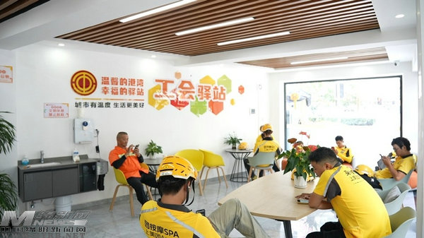 該驛站位于城市繁華地段,直飲機(jī)、微波爐、冰箱、空調(diào)、急救箱等設(shè)備一應(yīng)俱全,自帶的飯菜在這里可以加熱,此外還設(shè)有閱讀區(qū)、休息區(qū)和隨身設(shè)備充電區(qū)。“我喜歡靠在角落的大沙發(fā)上休息,別提多舒服了。在這里,不管白天還是晚上,只要累了就可以進(jìn)來休息。”說起驛站的便捷,外賣騎手陳順贊不絕口。