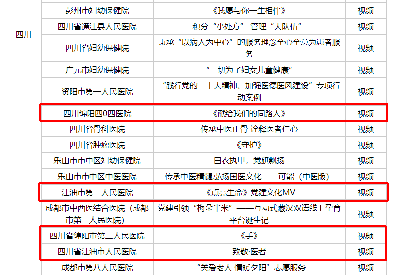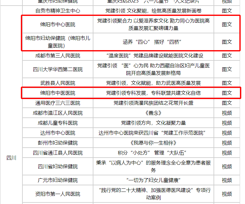近日,由全國醫(yī)院黨建工作指導(dǎo)委員會辦公室、中國衛(wèi)生健康思想政治工作促進會聯(lián)合指導(dǎo)國家衛(wèi)生健康委人口文化發(fā)展中心開展的“2023年黨建引領(lǐng)全國公立醫(yī)院文化建設(shè)優(yōu)秀案例征集活動”,評選出典型案例73個、優(yōu)秀案例189個。其中,綿陽市中心醫(yī)院、綿陽市婦幼保健院(市兒童醫(yī)院)、綿陽市中醫(yī)醫(yī)院、綿陽市第一人民醫(yī)院(四0四醫(yī)院)、綿陽市第三人民醫(yī)院、江油市人民醫(yī)院、江油市第二人民醫(yī)院7家公立醫(yī)療機構(gòu)選送的文化建設(shè)案例作品入選“優(yōu)秀案例”。
