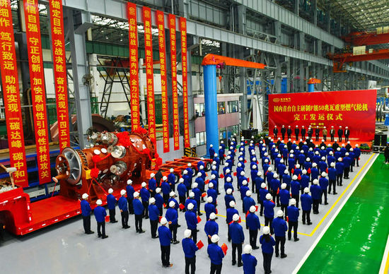 2022年11月25日,在四川省德陽市,東方電氣集團(tuán)研制出的國內(nèi)首臺自主研制F級50MW重型燃?xì)廨啓C(jī)(G50)完工發(fā)運(yùn)。新華社發(fā)(劉崗 攝)