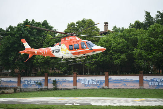 2024年6月20日,一架阿古斯塔AW109型載人直升機(jī)經(jīng)過兩次成都市域內(nèi)的往返飛行,完成成都市城市低空載人出行驗(yàn)證飛行任務(wù),探索成都低空經(jīng)濟(jì)的應(yīng)用場景。這是在四川省成都市都江堰市青城山起降點(diǎn)拍攝的參與驗(yàn)證飛行的載人直升機(jī)。新華社記者 胥冰潔 攝