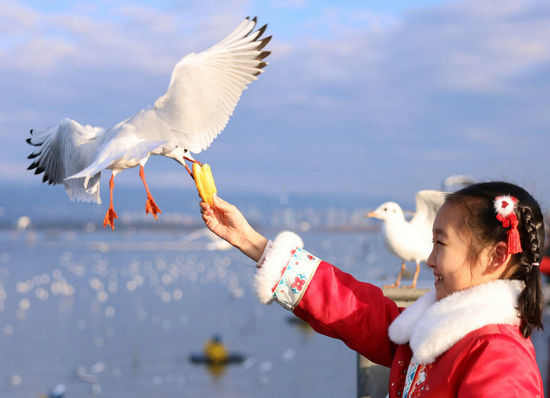 2024年1月17日,在云南省昆明市,游客在滇池邊喂紅嘴鷗。 新華社發(fā)(劉元嵩 攝)