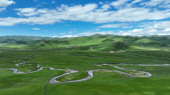 這是甘肅省甘南藏族自治州瑪曲縣阿萬倉濕地景色(2023年7月6日攝,無人機(jī)照片)。新華社記者 陳斌 攝