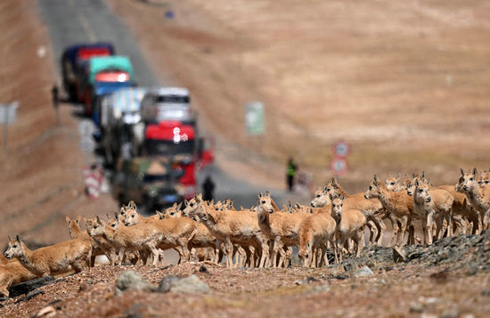 2023年5月29日,一群待產(chǎn)雌性藏羚羊在通過青藏公路前往可可西里卓乃湖產(chǎn)仔。新華社記者 張宏祥 攝